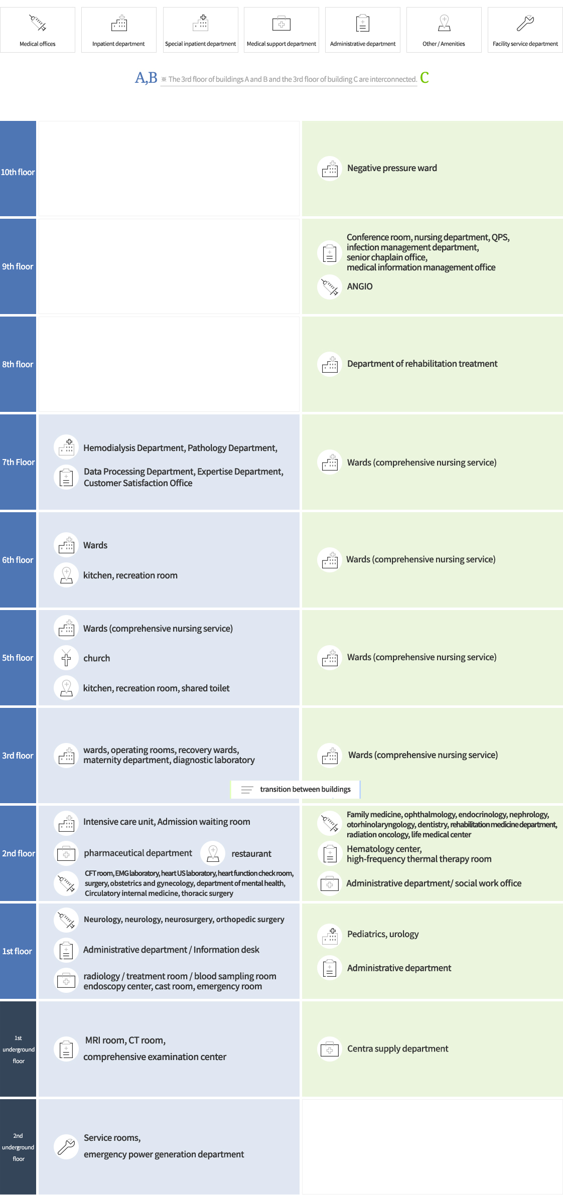 내과, 신경과, 신경외과, 정형외과 / 원무부/안내 / 영상의학과/주사실/채혈실/내시경센터, 석고붕대실, 응급실 |